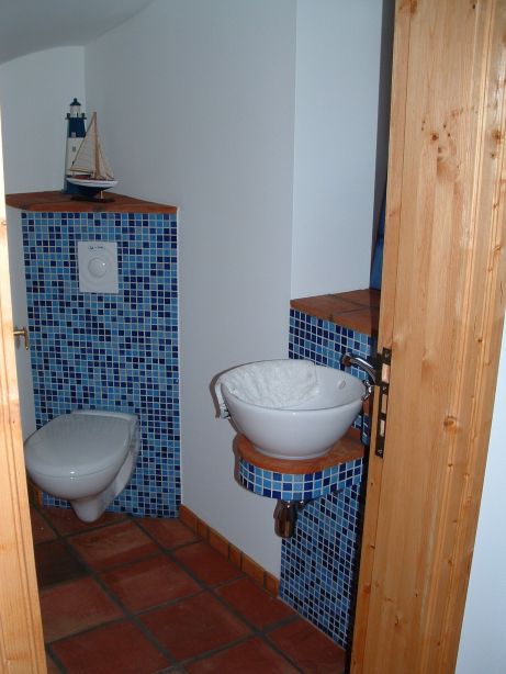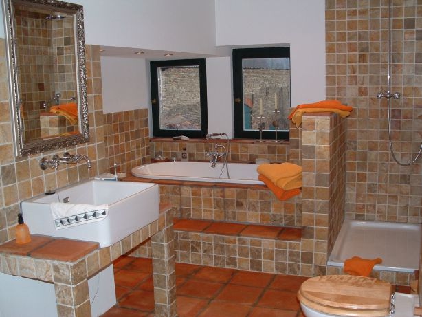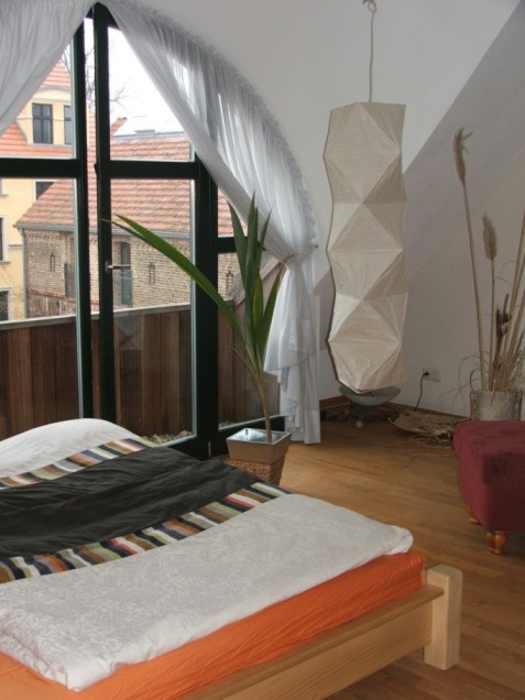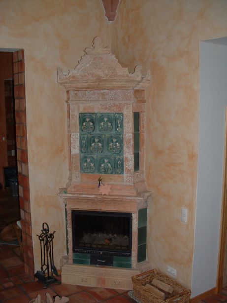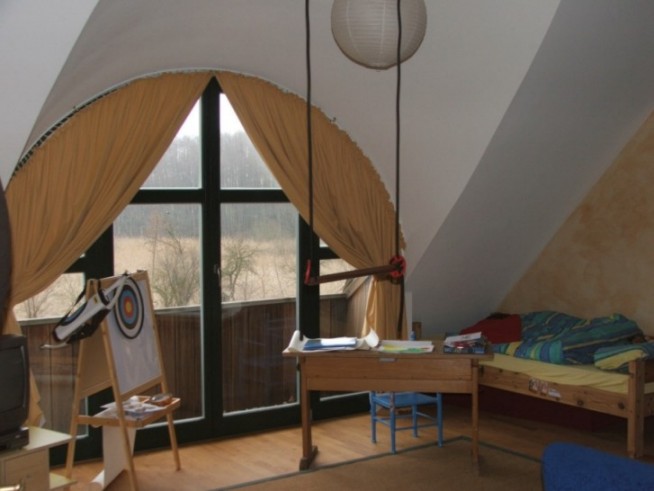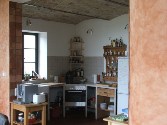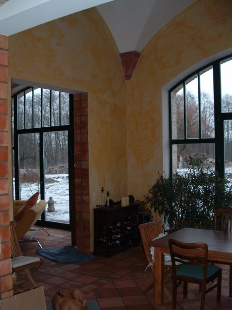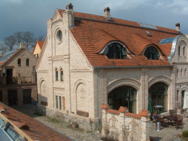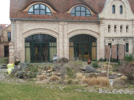 Die ehemalige Scheune Das Scheunengebäude richtet sich gleichzeitig zum Innenhof und zu den Gärten aus. Sie haben damit einen freien Blick auf Beete, Wiesen und das das anschließende Naturschutzgebiet, sowie auch auf die Schmuckfassaden des Hofensembles. Durch die Verwendung antiker Ziegelsteine entsteht der Eindruck eines alten, gewachsenen Gebäudes. Tatsächlich handelt es sich aber um einen Neubau in Form eines Doppelhauses, der die historische Tradition mit den Vorzügen moderner Bauweise - zweischaliger Außenwandaufbau mit Zwischendämmung - verbindet. Selbstverständlich entspricht die Haustechnik - zum Beispiel durch die Integration einer aufwendigen, solar unterstützten Strahlungsheizung (kombinierte Wand- und Fußbodenheizung) - modernen Anforderungen, um einen möglichst geringen Energiebedarf zu gewährleisten. Naturbaustoffe wie Lehmputz, Terra Cotta und Holz (Parkettfußböden) ergänzen das gesunde Wohnklima. Alle Fassaden wurden, wie gesagt, originalgetreu mit antiken Ziegelsteinen errichtet, und das Dach mit seinen gefälligen Fledermausgauben mit alten Biberschwanzziegeln gedeckt. So soll das stilvolle Ambiente eines historischen Hofes bestehen bleiben. Im Inneren vermittelt die Architektur durch Kreuzgewölbedecken (bis zu 4,8 m Höhe) bzw. "Preussische Kappendecken", große Rundbogenfenster in Gestalt der ehemaligen Scheunentore und Gauben mit „französischem“ Austritt ein einmaliges Wohngefühl in hohen, großzügigen, Lichtdurchfluteten Räumen. Eine großzügige, Feldsteingepflasterte Terrasse verbindet Wohnung und Garten.