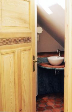 Marmorplatten und Terra Cotta sowie auf der Galerie ein Duschbad mit einer runden,