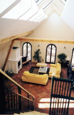 Die Höhe des Wohnzimmers reicht bis in den First (ca. 6 m); durch das