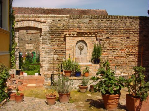 gelangen Sie über einen kleinen Innenhof mit Brunnen in die Wohnung.