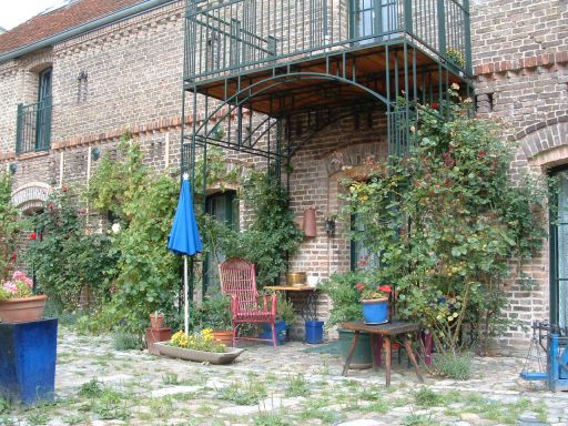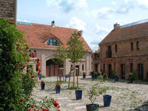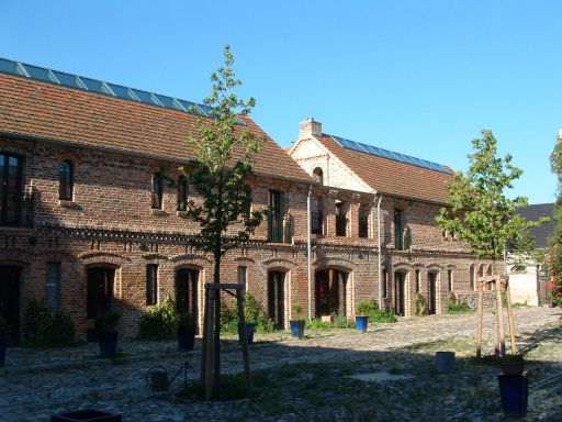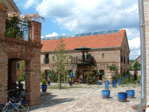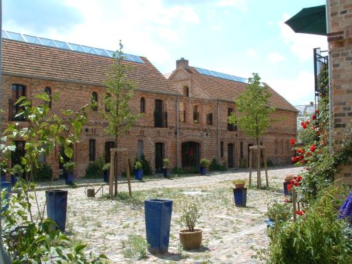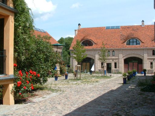 errichtet und wiesen Gesimsbänder und klein Der eingeschlossene Innenhof wurde wieder neu mit alten Feldsteinen gepflastert. Ein kleiner Brunnen plätschert und zwei Hofbäume laden zum gelegentlichen plaudern ein... Die zu Wohnungen umgebauten Wirtschaftsgebäude werden von acht Familien belebt. Aufgrund der Dimensionen des Hofes und der verschiedenen Eingangsbereiche kann man sich natürlich jederzeit zurückziehen. Dennoch scheint bislang eine nette Kommunikation zu funktionieren, regelmäßige Feiern auch mit den Nachbarn der umliegenden Höfe mit Wein am "Lagerfeuer" zeugen von einer netten Atmosphäre.